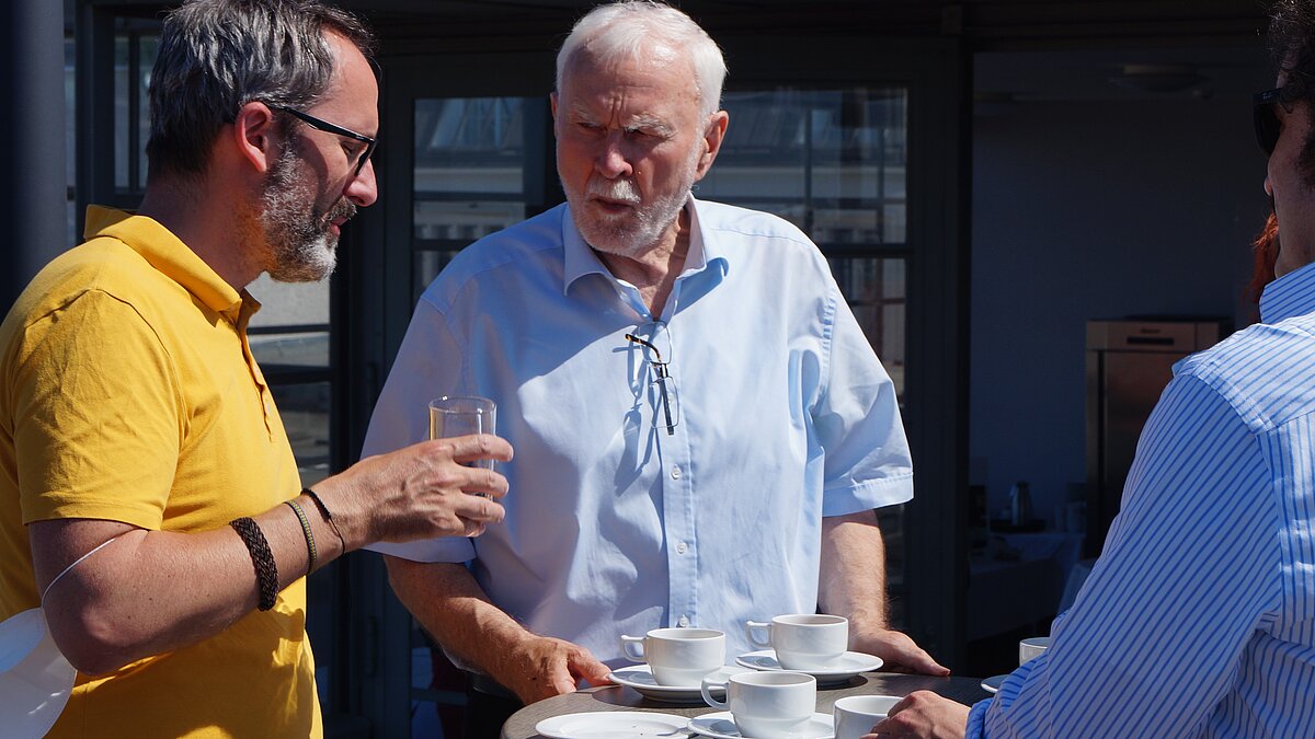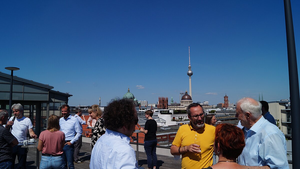 Bei über 30 Grad im Schatten verlagerten sich die Gespräche nach regem Austausch allmählich auf die Dachterrasse des Einsteinsaals. Hier ließen es sich die Teilnehmer*innen der Veranstaltung bei Kaffee und Kuchen, sowie mit einem wunderbaren Ausblick auf die Dächer von Berlin Mitte gut gehen.