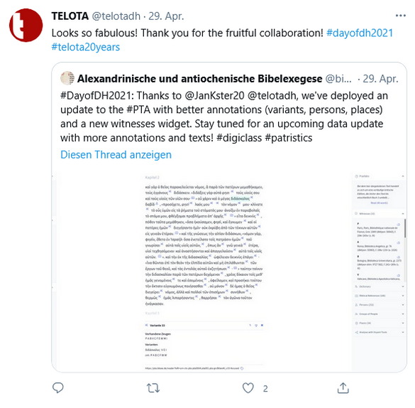 Am 29. April 2021 fand der internationale Day of DH statt, bei dem Digital Humanists aus aller Welt ihre Arbeit und ihren Arbeitsalltag auf Twitter unter dem Hashtag #dayofdh2021 vorstellen konnten. Nicht nur, aber auch anlässlich des 20. Geburtstags von TELOTA beteiligte sich das Team über den Twitter-Account @telotadh und unter dem Hashtag #telota20years mit einigen Tweets zur Arbeit von TELOTA sowie einem Projektschaufenster an der Initiative.