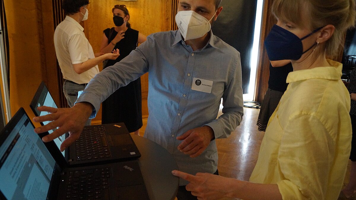 Nach einer kurzen Mittagspause fand die Posterstraße statt, die sieben verschiedene thematische Stationen umfasste, die die Arbeitsbereiche von TELOTA beschreiben: Forschungssoftware, Text & Edition, Visualisierung & Datenanalyse, Infrastruktur, Vernetzung und Kooperationen und DH-Community & Lehre. In der Posterstraße konnten die Teilnehmer*innen der Jubiläumsfeier von Station zu Station gehen und mit TELOTA-Mitarbeiter*innen über die Arbeitsfelder und Projekte ins Gespräch kommen. Auch einige Mitarbeiter*innen der Akademienvorhaben und Forschungsprojekte beteiligten sich an der Erstellung und Präsentation der Poster. An einzelnen Stationen wurde darüber hinaus angeboten, Digitale Editionen, Visualisierungen o.ä. live auszuprobieren.