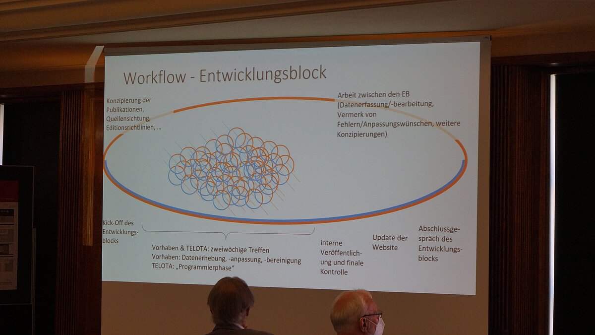 Im Anschluss an Grötschels Vortrag folgte ein Twin Talk, der die Besucher*innen mitten in den aktuellen Arbeitsalltag der Teams von TELOTA-Mitarbeiter*innen und der Vorhaben-Mitarbeiter*innen führte. In ihrem Vortrag „Zur Kollaboration von ‚Digital‘ und ‚Humanities‘“ beschrieben Dr. Annelie Große (BBAW, Anpassungsstrategien der späten mitteleuropäischen Monarchie am preußischen Beispiel 1786-1918) und Jan Wierzoch (BBAW, TELOTA), wie sich die Zusammenarbeit zwischen Geisteswissenschaften und Digital Humanities an der BBAW konkret gestaltet, indem sie den Workflow der Projektdurchführung und Softwareentwicklung vorstellten. Dabei werden sogenannte „Entwicklungsblöcke“ von 4-8 Wochen definiert, in denen das DH-Team gemeinsam mit den Vorhaben ein geplantes Zwischenziel umsetzt. Orientierungspunkt der Arbeiten ist ein „Backlog“, d. h. eine Aufstellung aller vorhandenen Aufgaben, Features und Bugs, aus der jeweils eine Teilmenge zur Bearbeitung in einem Entwicklungsblock bestimmt wird. Gerahmt und begleitet werden die Blöcke durch feste Treffen wie einem Kick-Off-Meeting, einem Entwicklungsgespräch und dem Review. Als besonders wichtig für eine gelungene Zusammenarbeit bezeichneten Große und Wierzoch einen offenen Kommunikationsmodus, um als Team Verständnis für alle Beteiligten herzustellen und gemeinsam zu wachsen.