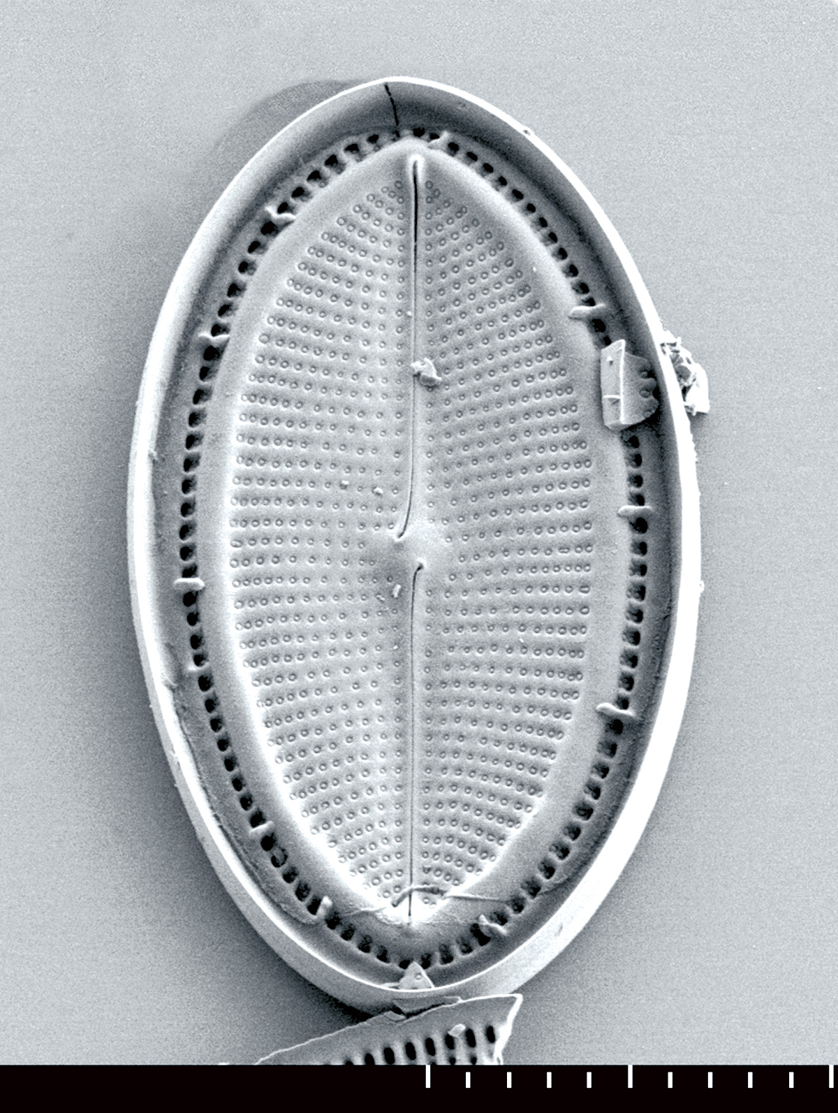 Regine Jahn, Wolf-Henning Kusber (Botanischer Garten und Botanisches Museum , Freie Universität Berlin) und ihre Kolleg*innen greifen bei der Erforschung der Kieselalge Cocconeis auf Ehrenbergs Zeichnungen (Abb. 1) und Präparate (Abb. 2) zurück. Er hatte die Gattung 1837 erstmals wissenschaftlich beschrieben. Der Vergleich der Zeichnungen und Präparate Ehrenbergs mit modernen lichtmikroskopischen (Abb. 3) und rasterelektronenmikroskopischen (Abb. 4) Aufnahmen hilft bei der Identifizierung von Cocconeis-Arten.