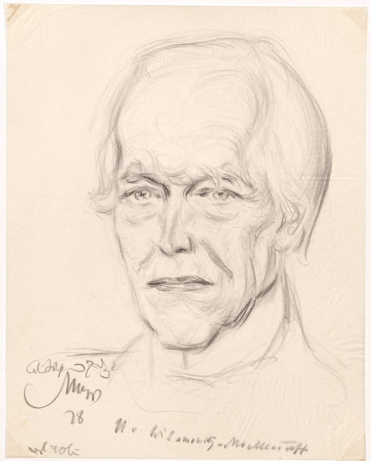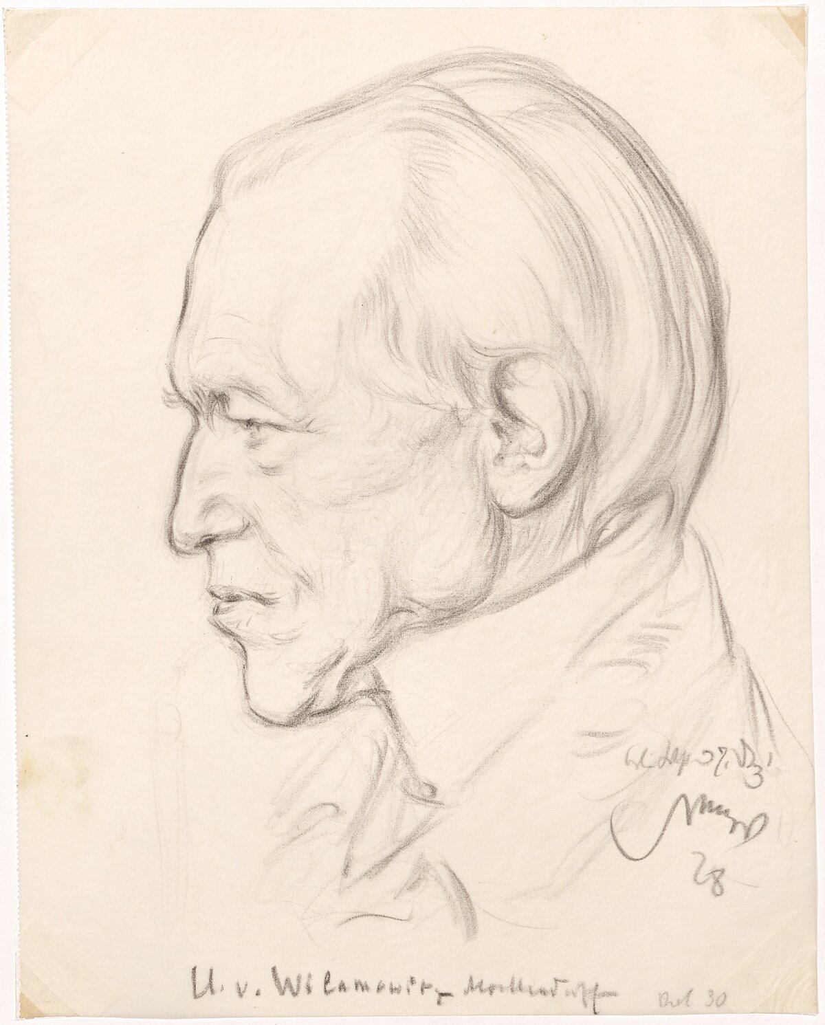 Emil Stumpp selbst schrieb in einem Ausstellungstext: Wenn er seine „Mappe mit der Ausbeute von ,Köpfen‘ zeige, […] wirken am meisten die Bildnisse aus dem Bereich des eigenen Schaffensgebietes. Die Dichter wollen Dichterbildnisse, Musiker die von Musikern sehen.“[6] So ist es naheliegend, zunächst eine Zeichnung eines Akademiemitglieds der damaligen Preußischen Akademie der Wissenschaften vorzustellen. In der Sammlung befinden sich zwei Porträts des klassischen Philologen Ulrich von Wilamowitz-Moellendorff (Abb. 2 und 3), der als ordentliches Mitglied besonders das bis heute laufende Akademienvorhaben „Inscriptiones Graecae“ prägte.