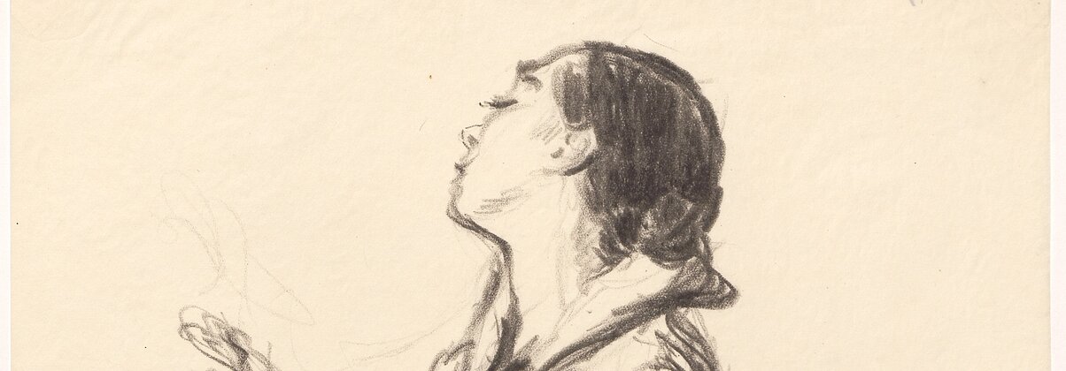 Doch er zeichnete nicht nur „Köpfe“. Stumpps Mappen sind ebenso gefüllt mit Landschaftszeichnungen, Aktdarstellungen und Ganzkörperporträts. Ein weiteres Werk aus der Sammlung zeigt die Tänzerin Tatjana Barbakoff im Jahr 1924 im Ganzkörperformat (Abb. 4). Sie dreht ihren Kopf mit geschlossenen Augen von den Betrachtenden weg. Ihre erhobenen Arme scheinen durch tänzerische Schwingungen Linien in die Luft gezeichnet zu haben. Die Form des langen Gewands deutet Stumpp durch schweifende Kreidestriche an. Vor allem die streng zurückgelegten, kohlschwarzen Haare und das im Tanz versunkene Gesicht ziehen in den Bann. Rezensionen ihrer Aufführungen beschreiben genau diese Qualitäten der Tänzerin. Sie sei „so ganz ohne jeden Willen mit uns im Zuschauerraum in Verbindung zu treten. Und ihre Tänze waren Träume, auch zauberische Brücken, von Stille zu Stille geschlagen.“[9]