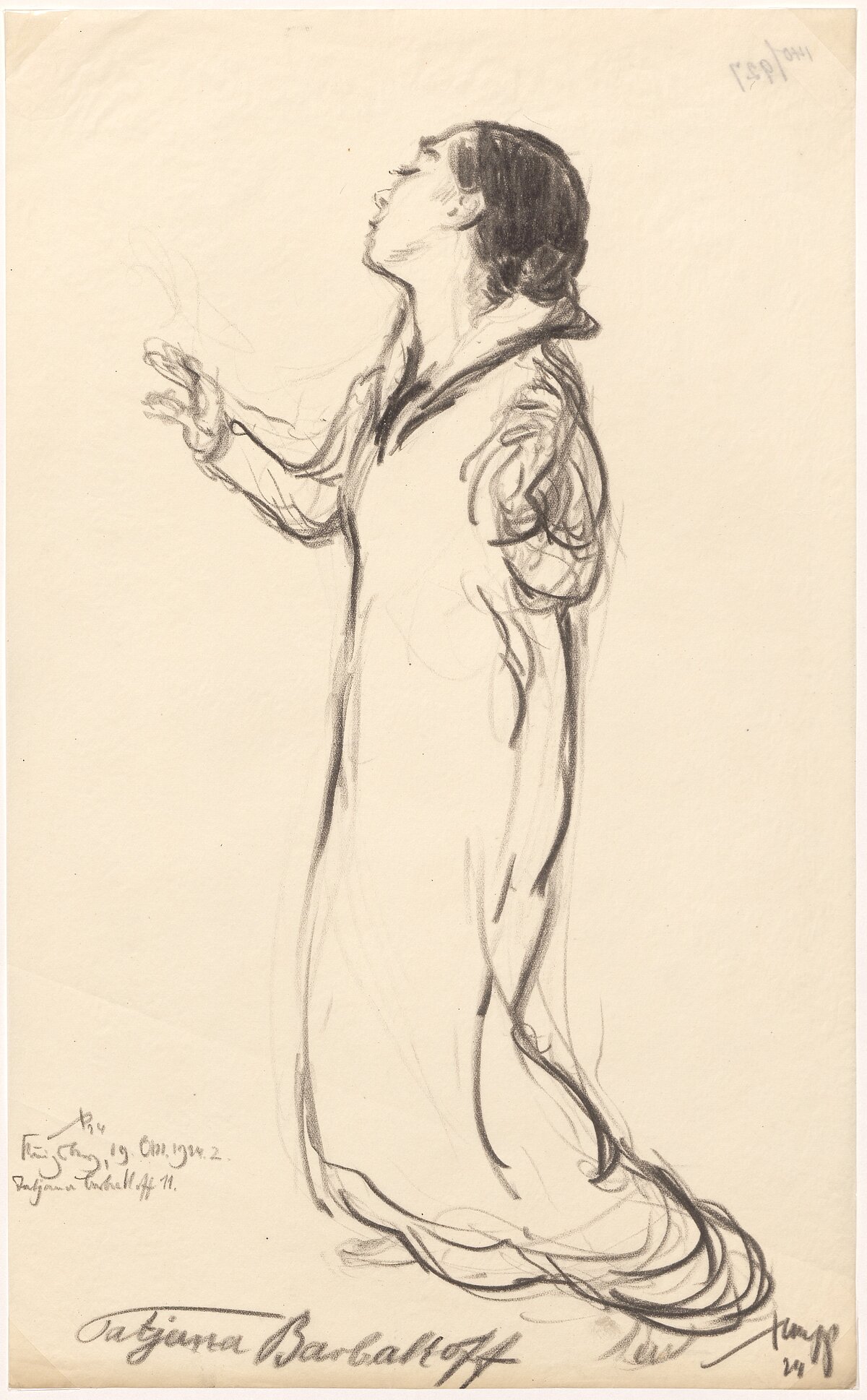Tatjana Barbakoff war Tochter einer chinesischen Mutter und eines russisch-jüdischen Vaters. In ihren Auftritten kombinierte sie ihre Kenntnisse aus dem klassischen Ballett mit Einflüssen ihrer chinesischen Herkunft und Bezügen zur zeitgenössischen Kunst. Doch auch Barbakoff ist heute kaum noch bekannt. Nach der Machtübernahme der Nationalsozialisten muss sie als Jüdin nach Frankreich fliehen. Im Februar 1944 wurde sie nach Auschwitz deportiert und in der Gaskammer ermordet. Es blieben von ihren Auftritten keine Filmaufnahmen oder Tonmitschnitte – nicht einmal eigene Niederschriften sind von Barbakoff bekannt. Nur noch Rezensionen und Porträts sind heute erhalten. So dokumentiert das Porträt von Stumpp die träumerische Kunst der Tänzerin, wie sie noch 1924 zu erleben war. Die Zeichnung hält ein künstlerisches Talent fest, das in der NS-Zeit vernichtet wurde und in Vergessenheit geraten ist.